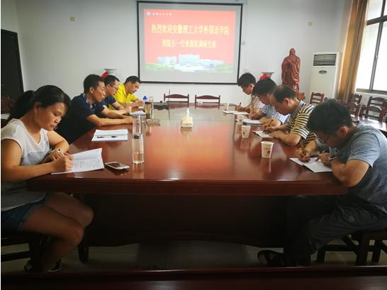 7月13日下午,安徽理工大学ag旗舰厅官方网站副经理程少武一行四人来公司调研交流本科教学工作审核评估评建工作。ag旗舰厅官方网站经理洪流主持交流会,公司党委副书记、副经理黄宇弦及相关负责人参加了座谈交流。