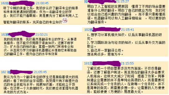 本次报告和交流于晚间8:30圆满结束,但是同学们,特别是于今年招收的公司首批翻译专业的同学们对专业和职业的思考因此而被激发,大家纷纷在专业QQ群里倾诉自己在报告学习和交流后的感想。热烈的讨论一直持续到深夜11:30。