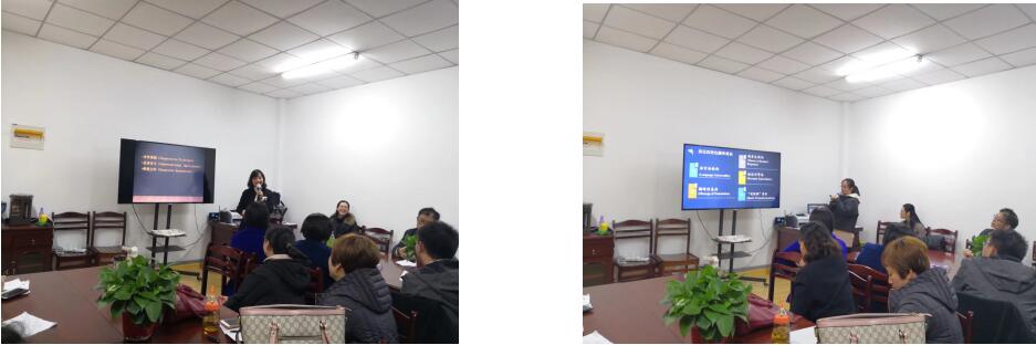 研讨会上,首先由吴然菊老师发言。她就合作原则视角下《绝望主妇》的会话含义研究这一主题,以幽默并且循循渐进的方式将听众带入了一个具有合作原则的会话之中,得到了不错的反响。接着,刘菱馨老师作为一个初入翻译领域的老师,向大家介绍了奈达及其翻译理论的相关知识,也希望借此次研讨会发言的契机能推动自己能从中学习到更多知识。