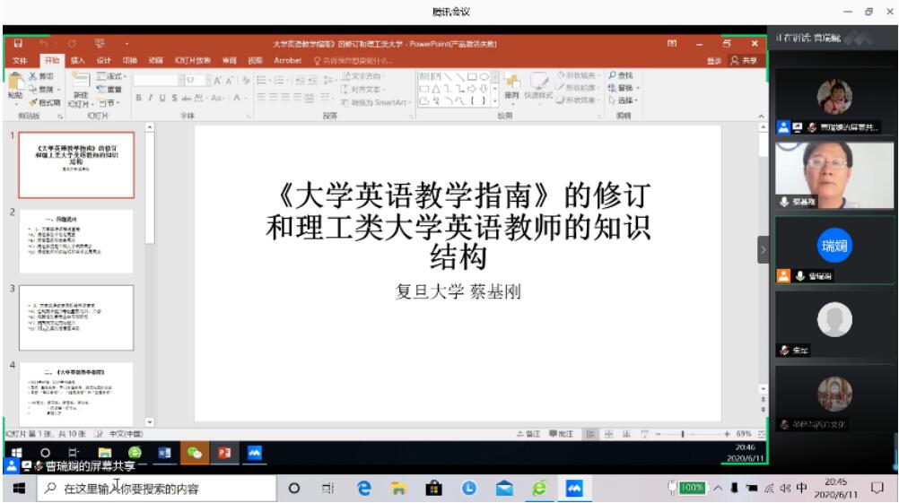 为积极稳妥推进公司大学英语教学改革工作,6月11日晚,复旦大学外国语言文学公司教授、博士生导师蔡基刚应公司邀请通过腾讯会议作题为“《大学英语教学指南》的修订和理工类大学英语教师的知识结构”的专题报告。其他受邀的校外专家、公司教务处处长郑啸、副处长徐宏、大学英语教学改革订制方案试点单位冶金工程公司教学副经理龙红明、ag旗舰厅官方网站经理曹瑞斓、副经理陈琳、及公司英语教师听取了报告。报告会由ag旗舰厅官方网站经理曹瑞斓主持。