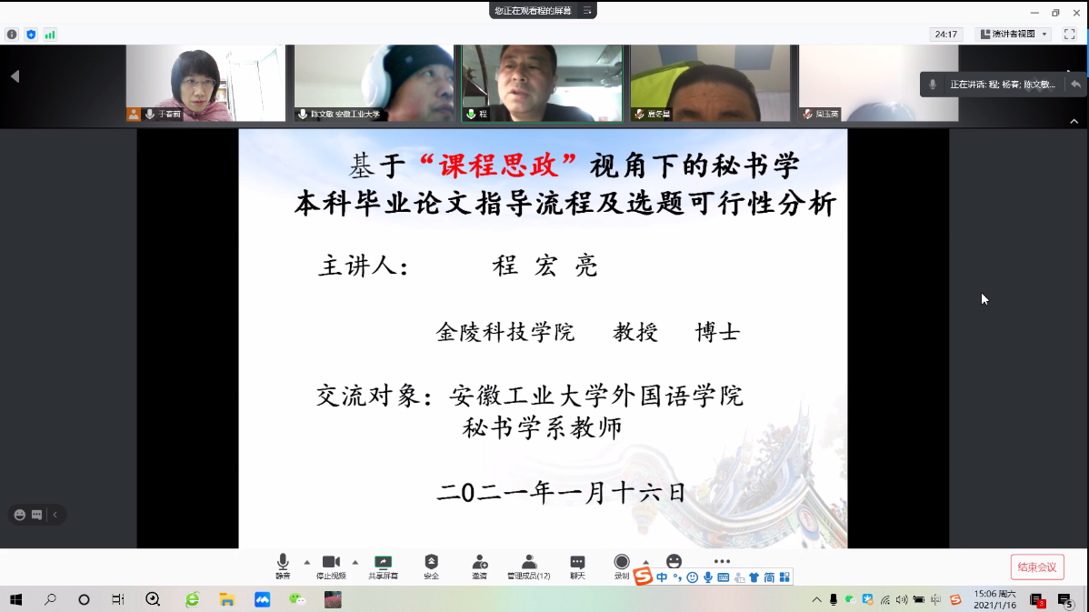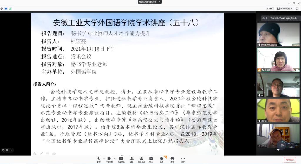1月16日下午3点,ag旗舰厅官方网站采用腾讯网络视频会议的方式,邀请了金陵科技公司秘书学专业学科带头人程宏亮教授,面向秘书学专业教师,举行了一场以“秘书学专业教师人才培养能力提升”为主题的学术讲座。会议由ag旗舰厅官方网站陈琳副经理主持,全体秘书学专业教师聆听讲座并和程教授展开了详细的交流。