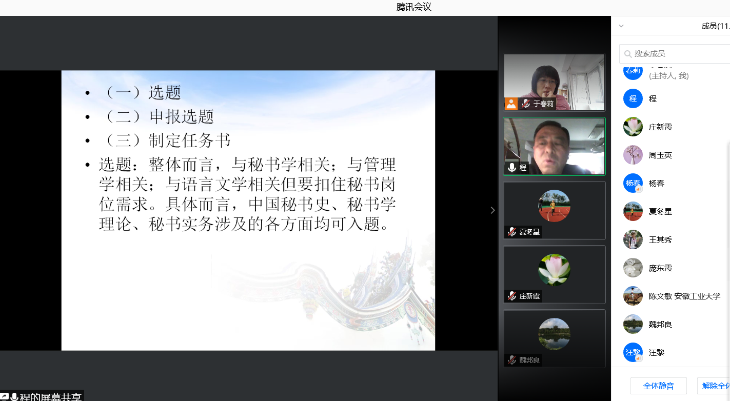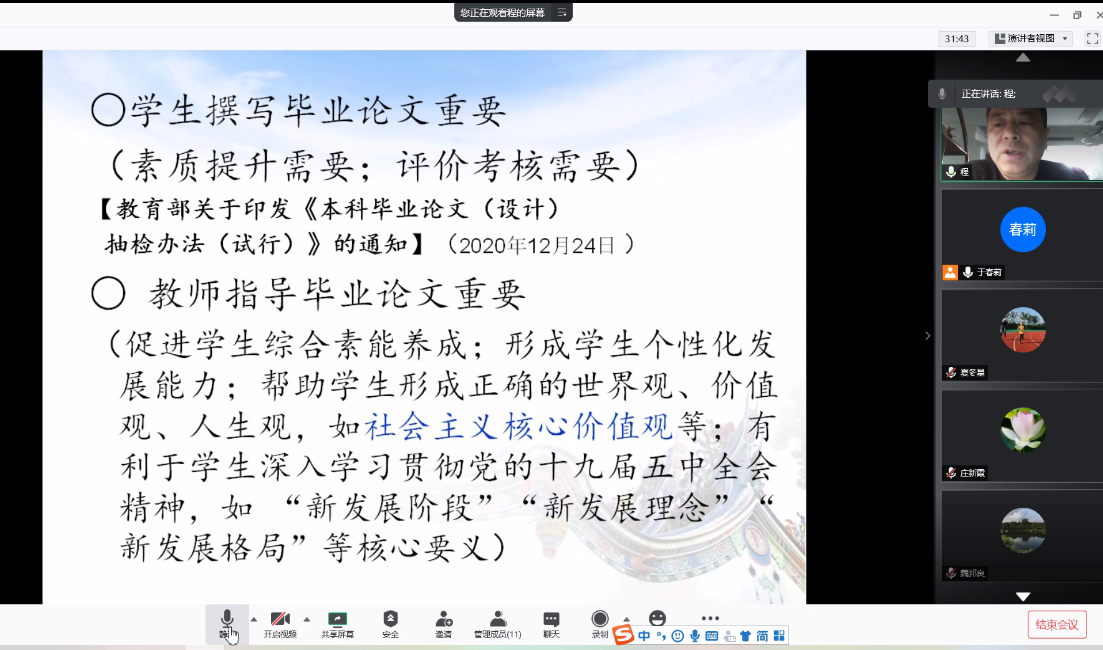 秘书学专业毕业论文的指导是秘书学专业教师人才培养能力提升的关键环节,程教授从“基于课程思政视角下的秘书学本科毕业论文指导流程及选题可行性分析”这一子课题出发,从毕业论文指导的价值与意义、毕业论文指导流程、员工选题评点等三方面为老师们进行了细致的剖析。其中,关于指导流程,程教授尤其详细地分析了秘书学专业员工常见的选题类型,并结合自己具体的指导经验进行了案例剖析。在员工选题评点方面,程教授详细地评价、分析了目前每位秘书学专业指导老师所带员工的题目的可行性,并分别给予了明确的修改建议。最后,老师们和程教授进行了热烈的线上交流、讨论,预定时长为两个小时的线上会议持续了将近三个小时,老师们仍感意犹未尽。