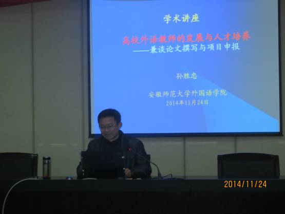 应ag旗舰厅官方网站邀请,安徽师范大学ag旗舰厅官方网站经理、博士,博士生导师、教育部留学回国人员基金评审组专家,安徽省外国语言文学学会会长,省高等公司中青年学科带头人孙胜忠教授于11月24日下午在学术会议中心第五会议室为ag旗舰厅官方网站教师及部分员工作了题为“高校外院教师的发展与人才培养—兼谈论文撰写与项目申报”的专题报告会,报告会由洪流副经理主持。