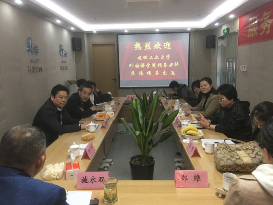 4月9日上午,考察团来到了以译创校企合作中心为运营主体的安徽高校语言服务联盟基地。译创公司总经理施永双专程从外地赶回接待了考察团,业务经理朱小二向考察团详细介绍了译创公司的业务,包括提供语言服务解决方案和搭建涉外语言公共服务平台等。黄宇弦书记希望通过校企合作,进一步加强公司在员工实习实训、一流专业和一流课程以及现代语言服务技术应用等方面的建设,提高教师教学和科研水平,切实实现和深化产教研融合。施永双表示将全力推进校企合作,与公司保持密切沟通,结合企业优势,提供就业实习、职业规划、课程培训、平台搭建、资源共享以及科研教研等方面的支持,不断提高合作成效。
