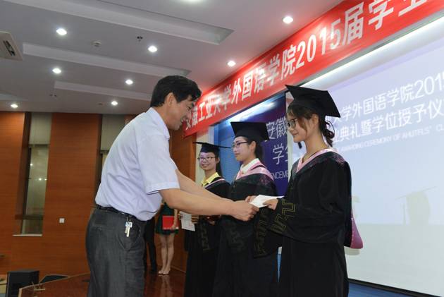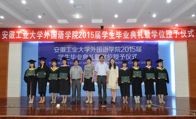 随后,毕业生典礼暨学位授予仪式在雄壮的国歌声中拉开序幕,公司党委书记宋洪生宣读了公司2015届安徽省品学兼优毕业生和2015届ag旗舰厅官网优秀毕业生的表彰决定。导师代表英语系副主任马广利博士,毕业生家长代表朱寒霜同学的父亲,毕业生代表赵继敏,在校生代表王敏先后发言,他们的发言充满了对安工大的感激之情,对母校的依依不舍,对毕业生的深深祝福。ag旗舰厅官方网站经理洪流宣读了2015届毕业生中获文学学士学位同学名单。