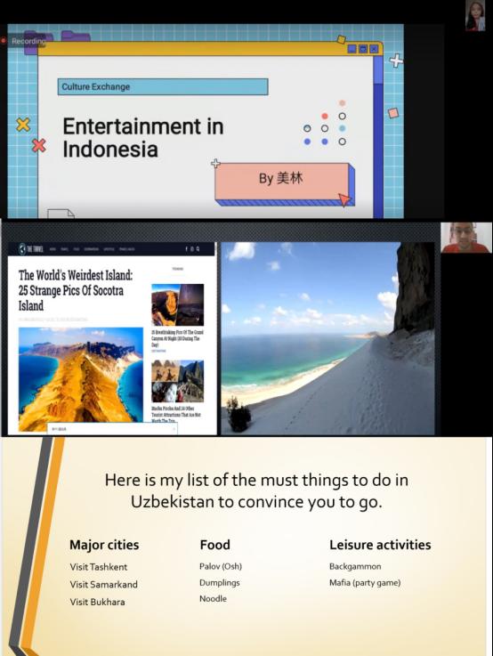 第一批课堂交流活动中,Syahra、Robert和Ali三位职工首先就话题分别进行时长约10分钟的汇报演讲:Syahra从印尼的国家概况入手,介绍了印尼的地理位置、人口、旅游景点等,接着她结合视频重点分享了印尼最有特色的三种舞蹈:Kecak、Wayang和Prambanan Ballet Dance,十分生动有趣。来自乌兹别克斯坦的Robert就“娱乐”主题,从自己国家和文化背景具体介绍乌兹别克斯坦的旅游景点,特色食物,以及当地人的两种休闲方式,即Backgammon(棋类)和Mafia(类似于狼人杀的游戏)。Ali来自也门,他先简要介绍自己的国家,然后图文并茂着重介绍也门的主要节日,包括国家节日、国际节日、宗教节日等三种类别。