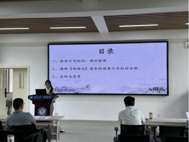 紧接着,韩晶晶同学介绍了《译者行为批评:理论框架》一书的基本内容,其中包括译者行为批评的三大视域和求真–务实连续统理论框架。基于读书体会,她试图运用该理论框架,从翻译外行为和翻译内行为两个层面分析海斯《西游记》译本的译者行为,展示了扎实的理论功底和独特的分析视角。