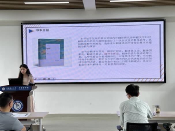 随后,杨惠惠同学分享了《翻译论》一书的阅读心得。她着重介绍了数字化时代与机器翻译的相关内容,并结合党的二十大报告的翻译实践,从视域融合视角探讨了数字化时代译者主体性的发挥。汇报引发了与会同学的热烈讨论。