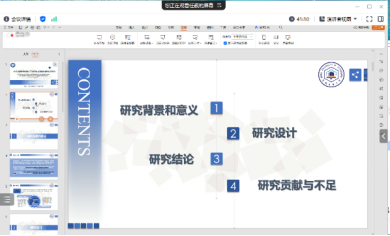本次预答辩和开题报告分为研究生个人汇报、评审组老师提问两个环节。首先,参加开题答辩的研究生谢佳丽从选题的目的和意义、选题依据、国内外研究现状、研究内容与框架、研究方法和技术路线、预期研究成果和论文工作进展安排等方面进行了详细的开题汇报,评审组老师认真听取了报告,针对研究选题的科学性、可行性、创新性等提出了宝贵的修改意见。