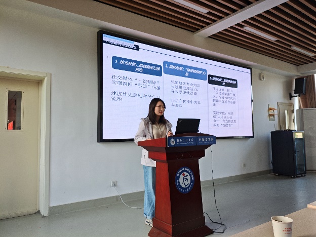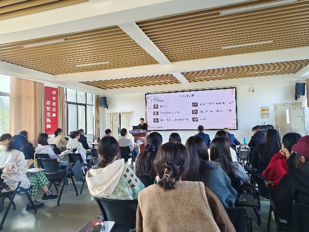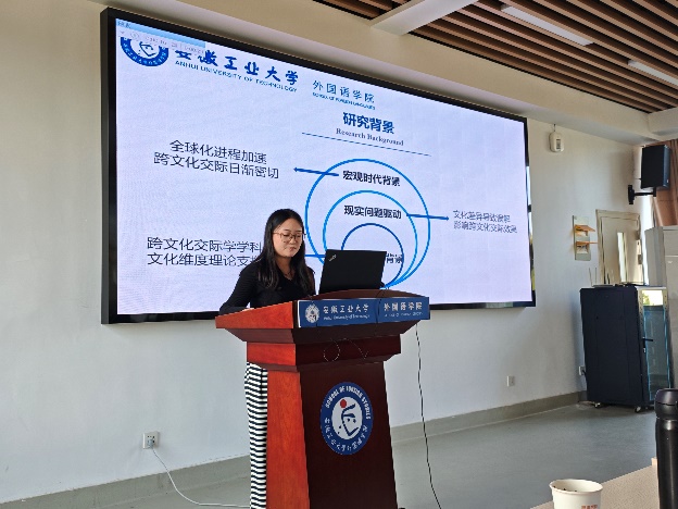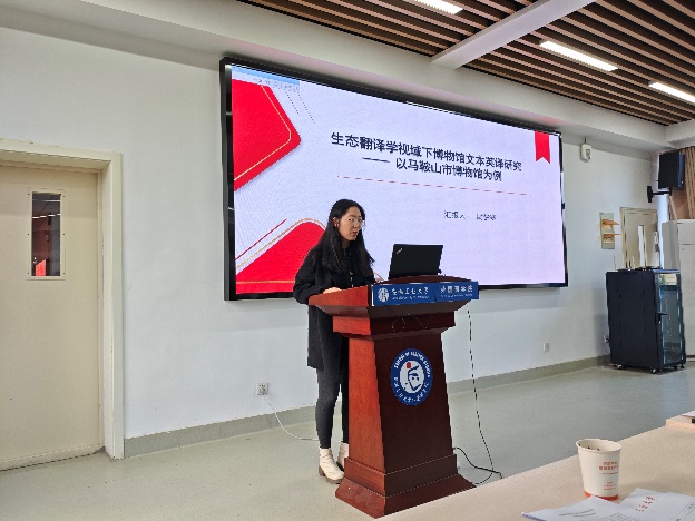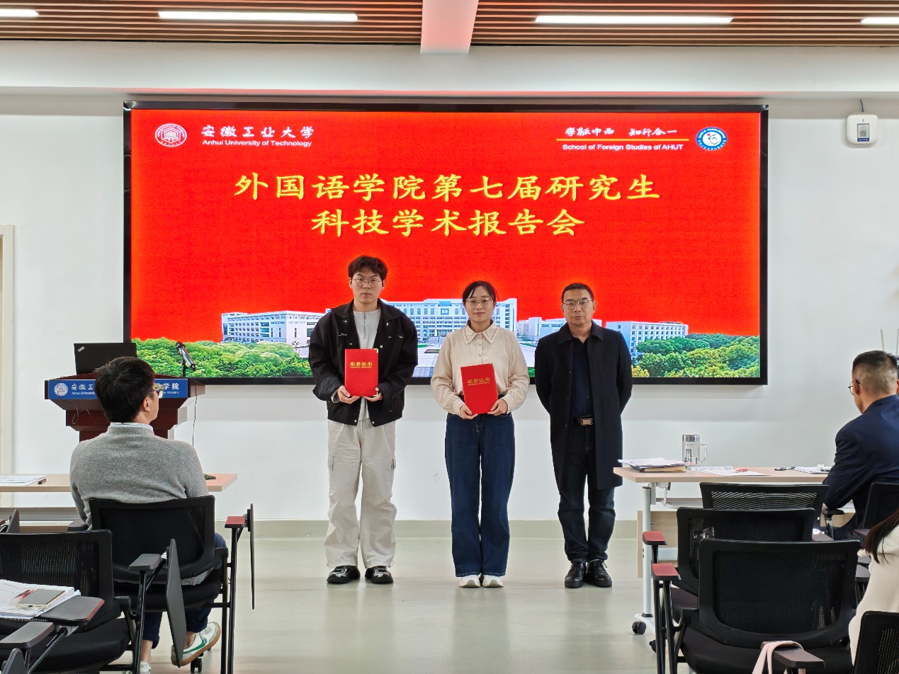 按抽签顺序,2025级研究生孟令怡、陈慧颖、李潇潇、2024级研究生陈思雨、胡雨朦、王宝龙、汪倩、尉梦寒、2023级研究生李献献分别作了主题为“中国神话在对外汉语文化教学中的应用研究”“中国传统节日文化融入初中英语教学的路径研究”“跨文化交际中中西方送礼文化差异”“语境顺应论视角下《慎子》的英译对比研究--以谭朴森和郝令喆译本为例”“多模态话语分析视角下渡江战役纪念馆英译研究”“英语立法文本中“as”的语用功能探析”“社交平台新闻机译的‘弱逻辑’陷阱与译者主体性重拾”“生态翻译学视域下博物馆文本英译研究——以马鞍山市博物馆为例”“《红楼梦》‘粥膳’饮食文化英译研究”的学术报告,各评委专家进行现场提问及评分,最终尉梦寒同学荣获一等奖并被推荐代表ag旗舰厅官方网站参加公司第十六届研究生科技学术报告会。最后,评委专家们为各位参赛同学现场颁发了获奖证书。