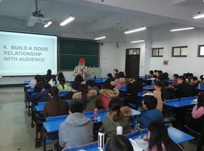12月22日下午, 中央民族大学教授,社会学博士,外研社杯全国英语演讲大赛评委,中国政府友谊奖、长城友谊奖的获得者Mark Levine(马克力文)在秀山校区汇文楼D 312,为全校师生做了一场题为《A Dozen Tips onSuccessful Public Speaking Delivery》的报告。报告由ag旗舰厅官方网站副经理曹瑞斓教授主持,来自公司英语专业和冶金、化工、管工、艺设等专业的部分师生到场聆听了报告。