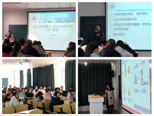 12月12日下午,ag旗舰厅官方网站大外一部英语教师王敏作为应邀专家,走进翻译专业2019级“翻译概论”课堂,在佳山校区教一419作了一场题为“新文科视阈下《冶金与材料笔译》漫谈”的精彩讲座。王敏老师主要研究方向为美国文学、大学英语教学及翻译实践。近年来在在省级学术期刊发表学术论文7篇,出版译著一部。主持校级课题两项,参与省级教改课题一项。