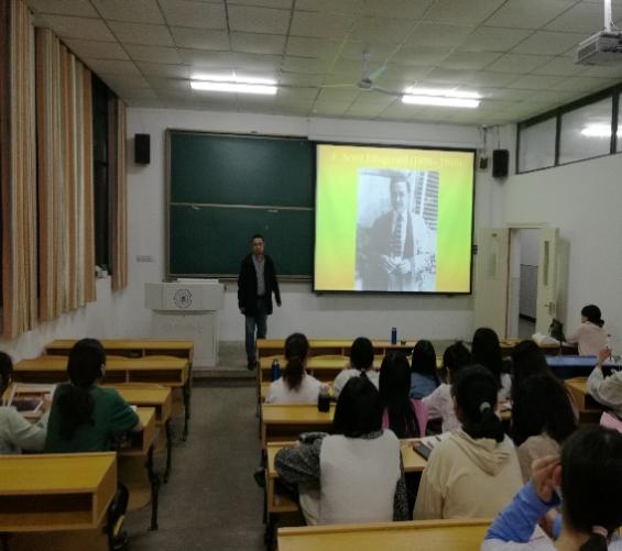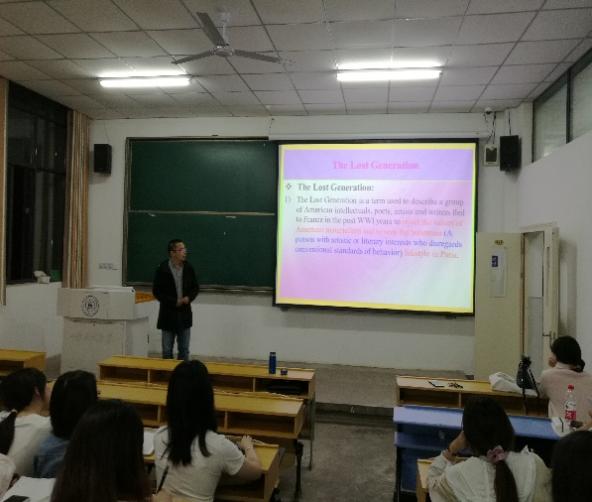 5月17日晚在教一107教室,ag旗舰厅官方网站外语系主任、马广利博士走进课外阅读实训课堂,作了一场关于美国20世纪最杰出的作家之一菲茨杰拉德的代表作----《了不起的盖茨比》小说赏析的专题讲座,实训指导老师蒯振华和汤红老师以及19级翻译专业全体同学聆听了马博士的精彩讲座。
