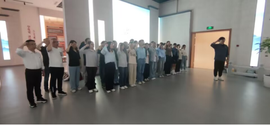 参观结束后,在宣誓大厅,面对鲜红的党旗,全体正式党员重温入党誓词,2024年上半年新发展党员入党宣誓,表达坚定信念,对党忠诚。