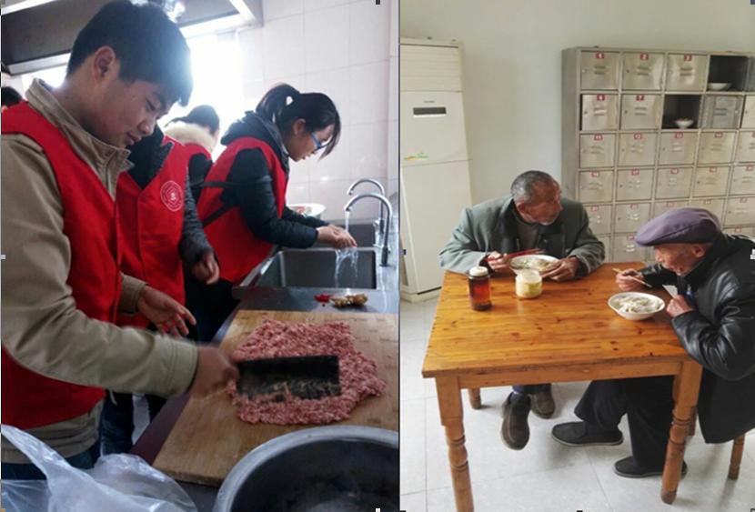 当日早晨,同学们“兵分六路”,有的捏着列好的清单赶赴超市购买食材,有的提前赶赴敬老院打扫准备,有的则帮助老人们晾晒棉被。等到采购小组带回来新鲜美味且具有春季特色的饺子食材后,全体同学撩起袖子洗净双手忙活了起来。择菜洗菜和面擀面,同学们热火朝天又各司其职、分工明确。待到中午时分,一大锅热腾腾的饺子为“夕阳红”们端上了桌子。考虑到老人们的健康、饮食习惯,为了避免牙齿不太好嚼不动的状况,同学们贴心的准备了荠菜肉、白菜粉丝等多种饺子,并在每一种馅料里添加了增加松软度的豆腐。美味的饺子为老人们送来了春日里最贴心的温暖,吃完饺子,大家又继续在敬老院开展了一系列老少互动游戏,大家唠唠嗑,聊聊家常,最后才依依惜别。