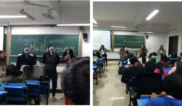 活动以契合主题的英文电影开幕,电影精彩处,职工们打扮成各色鬼怪由后门悄悄步入,口语交流正式开始。游戏环节——“Truth or Death”是此次活动最考验会员口语水平的环节,紧张的氛围中,会员们忘却了口语交流中的腼腆,穷尽其辞,努力用自己的词汇量做出最贴切的表达。随后职工表演了具有中国时代特色的《青春修炼手册》、凤凰传奇歌舞节目,中国员工则表演了西方歌舞,现场气氛热烈。