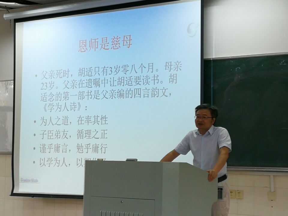 下午两点半,所有同学准时来到指定教室,并快速有序的入座。随后,大家以热烈的掌声欢迎了魏邦良老师的到来。“大家都对一些著名的人物有所了解,今天我来为大家讲讲文学家胡适,让同学们更加深刻地认识这位伟人。”魏老师以这句话展开了今天的讲座。在听讲中,同学们了解到文学家胡适的家庭教育为他的成功奠定了一定的基础,既有父亲遗书中的言辞鼓励,也有母亲温暖的谆谆教导。在讲座中,魏老师以史实结合故事的讲述方法,使讲座更加有趣,让同学们更加深入地了解到胡适的文学历程。与此同时,自主学习,坚定毅力的信念种子在新生们的心里扎根发芽。